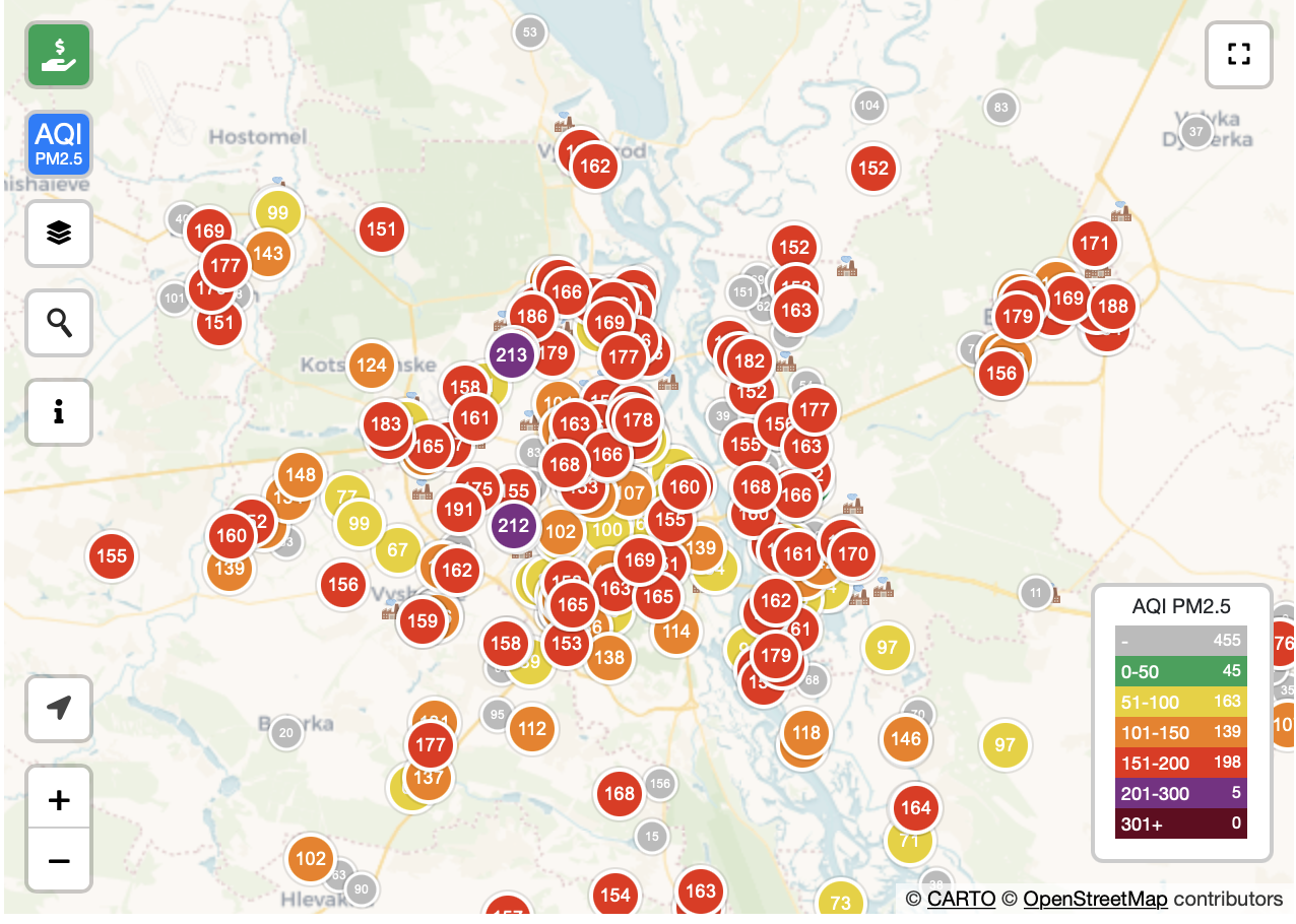 В то же время их слова подтверждают и данные экологического приложении SaveEkoBot, согласно которому показатели загрязнения воздуха в Киеве находятся на отметке 186 пунктов — "вредный уровень" и ниже. Фактически весь город является "красным", что означает, завышенный уровень загрязнения воздуха.