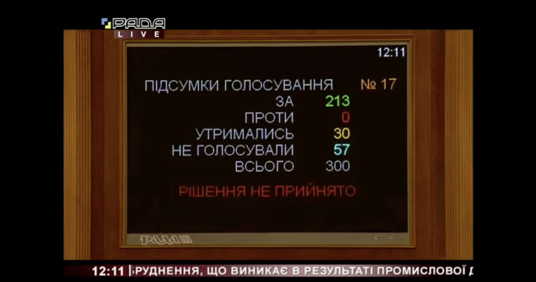 "За" такое решение проголосовало 213 народных депутатов, при необходимых 226, воздержались — 30. Таким образом законопроект отправили на доработку.