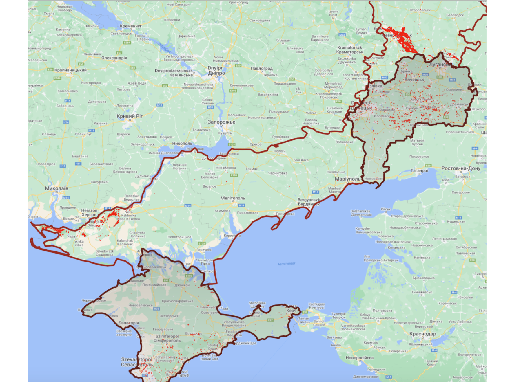 Рисунок 1: временно оккупированные территории Украины на 1 мая 2023 года (серый фон – с 2014 года, прозрачный – с 24 февраля 2022 года). Потери лесного покрова по состоянию на конец 2022 года отмечены красным цветом.