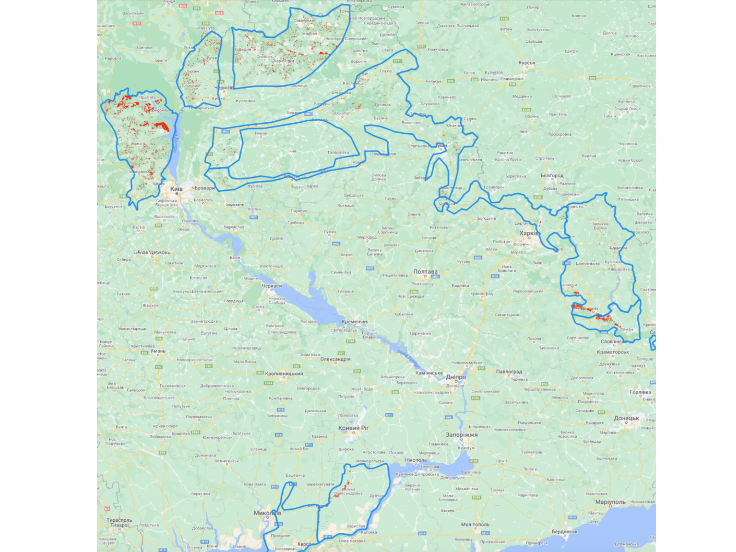 Рисунок 2: освобожденные оккупированные территории по состоянию на 1 мая 2023 года. Потери лесного покрова по состоянию на конец 2022 года отмечены красным цветом.
