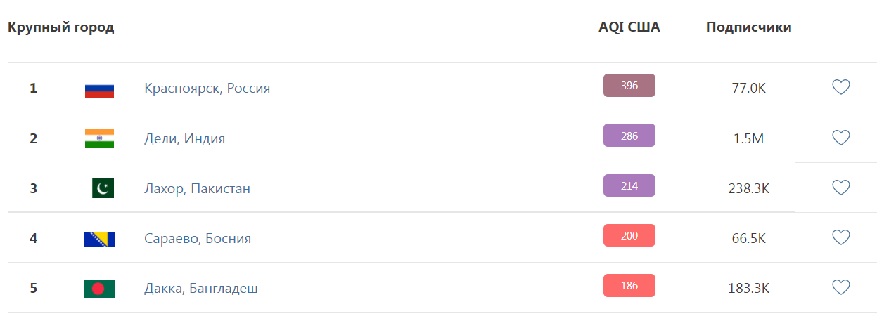 Тим часом найвищий рівень забруднення зафіксували в російському місті Красноярськ. У першу трійку також увійшли Делі, столиця Індії, та місто Лахор у Пакистані.