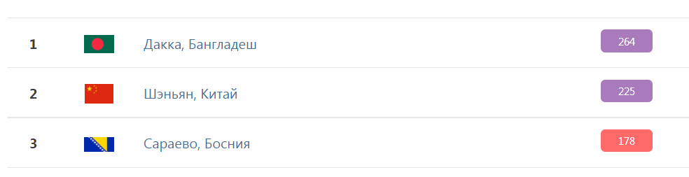 Водночас найгірша ситуація із забрудненням повітря спостерігалася в містах Дакка (Бангладеш) і Шеньян (Китай), де рівень забруднення "дуже шкідливий". У першу трійку в списку міст із найбруднішим повітрям також потрапила столиця Боснії — Сараєво.