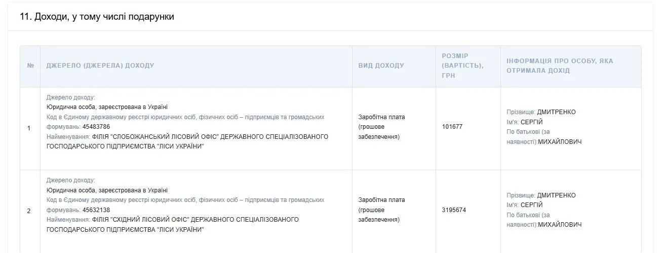 Очільник "Східного лісового офісу" Сергій Дмитренко за 2023 рік задекларував понад 3 млн 195,6 тис. грн заробітної плати. Додатково 101,6 тис. грн він отримав від "Слобожанського лісового офісу".