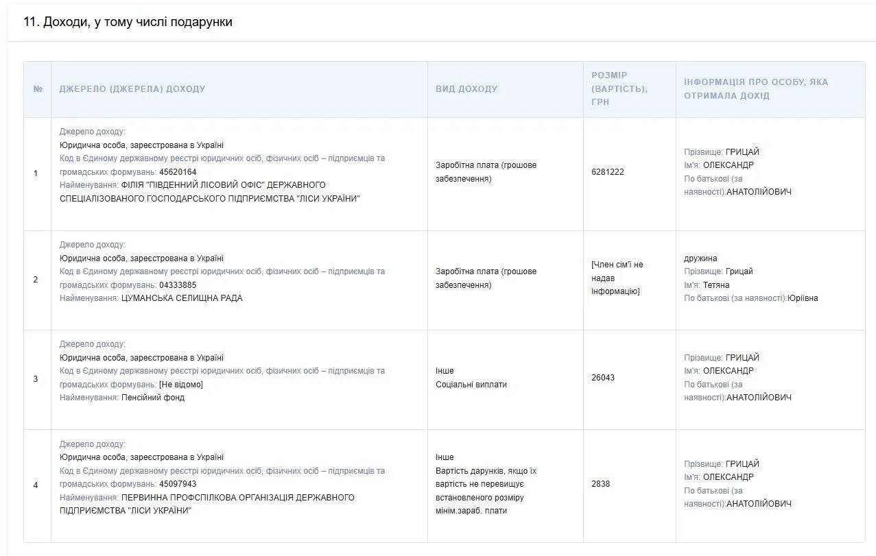 Заробітна плата очільника "Південного лісового офісу" Олександра Грицая у 2025 році склала 6 млн 281,2 тис. грн. Щомісячно в середньому він отримував близько 403 тис. грн вже після вирахування податків.